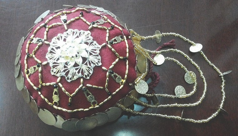 Red cotton cloth, underlaid with a circular tepeouk, decorated with golden pearls and metal coins.