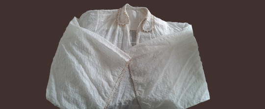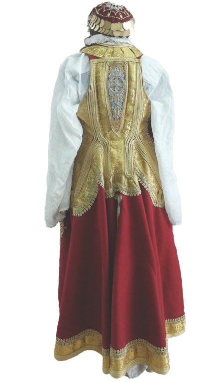 Платно од свиле ткано у две нити са узводом. Чипка од конца рађена једном иглом, шљокице асприце. Бочно проширена клиновима, ручно шивена.