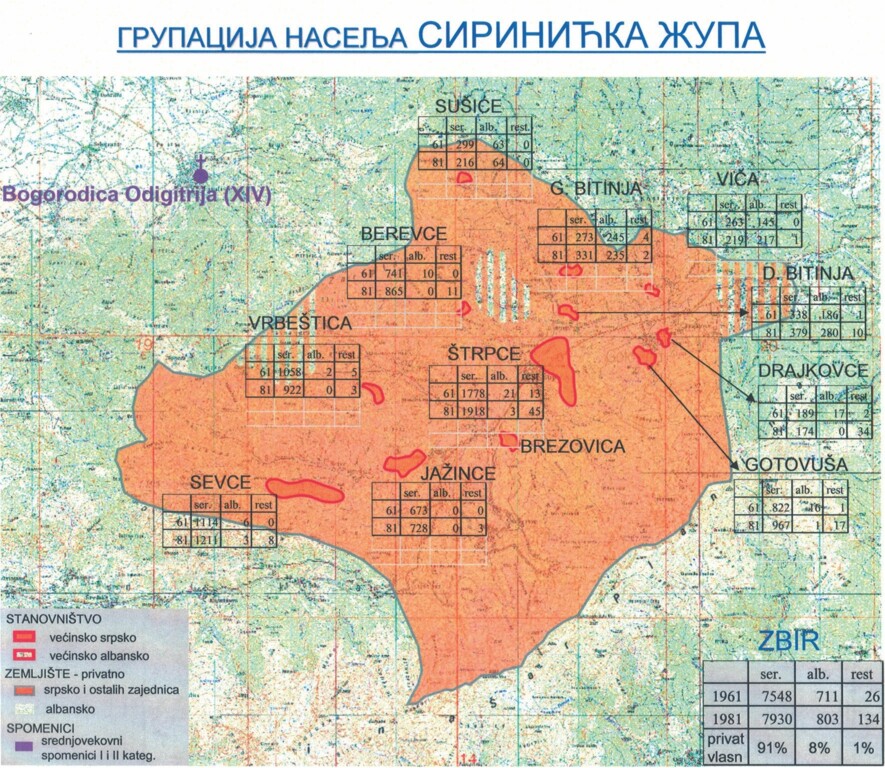 Сиринићка жупа је опстала под турском окупацијом и у свим великим ратовима, али су последице видљиве у демографској структури. У општини данас живи око 13.600 становника, од којих је 9.100 Срба, 4500 Албанаца и 30 Рома, са малом просечном густином насељености од око 60 становника на квадратном километру, што је карактеристично за брдско-планинска подручја. Основна демографска обележја су спор раст укупног броја становника и мешовити национални састав. Територијални распоред становништва је изразито неуравнотежен.