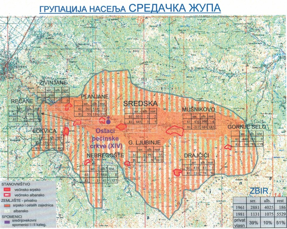 Изузев Горњег Села, које у повељама налазимо под именом „село на Средској”, остала села су имала иста имена. Данас више нема села Жештане које се у повељама помиње, али се нагађа да се налазило између Живињана и Плањана. Могуће је, такође, с обзиром на чињеницу да се граничило с атаром села Речана, да то село може бити данашње Стајковце или Живињане. Само помињање ових села у XIII веку знак је да су она постојала и раније, али су сва била манастирски поседи – земља, људи и остала имовина, а које је од њих припадало манастиру Св. Архнгела или Хиландару зависило је од владара, који је манастирима даривао и по више села. Како су се ти поседи мењали, долазило је до расправе између самих манастира. Тако је цар Душан неколико села даривао Хиландару да би након кратког времена нека од њих поново вратио и даривао свом манастиру Св. Архангела код Призрена.